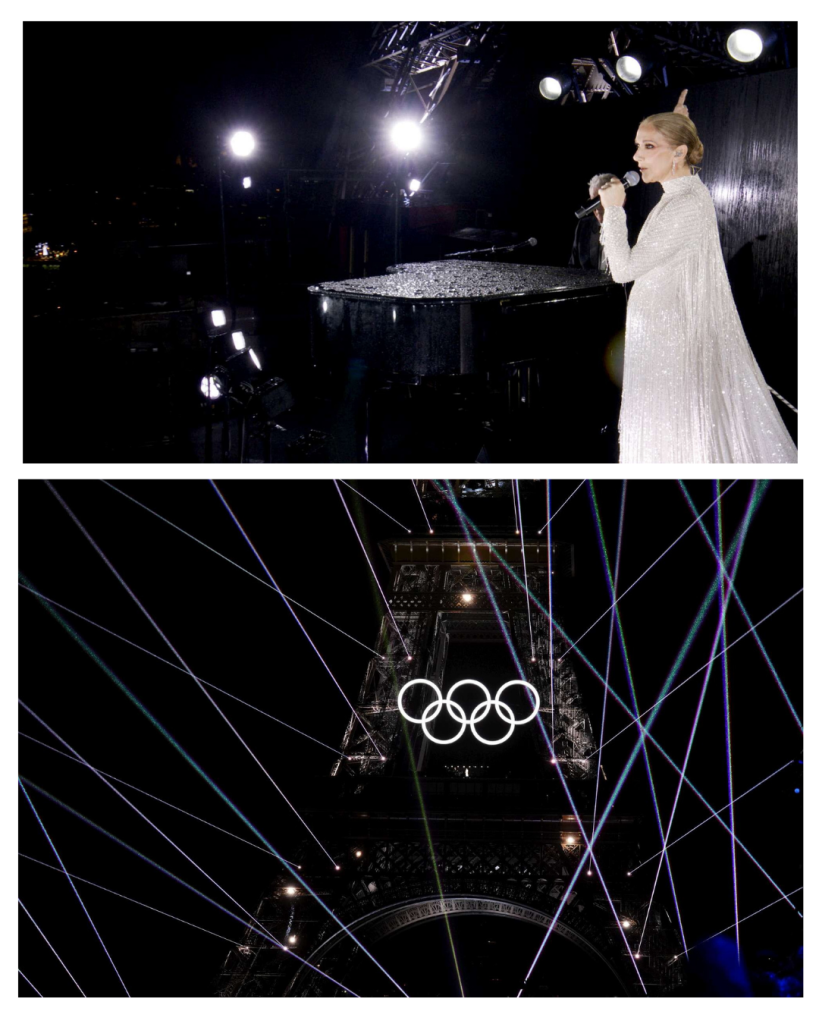 Un pianista ed un pianoforte a coda, tutto magicamente avvolto nella notte, salvo una magnifica e lunare Celin Dion in Christian Dior, iconico stilista della Haute Couture francese brand oggi parte del gruppo LVHM, con abito e strascico impreziosito da migliaia di perle e cristalli che riflettono, sulle note dell’Inno all’Amore di Edith Piaf, l’ “ombra luminosa” della Tour Eiffel, ora siglata con la luce stessa dei 5 Cerchi Olimpici, ricordando al mondo con significativo orgoglio che Parigi è sempre magnificamente Parigi!