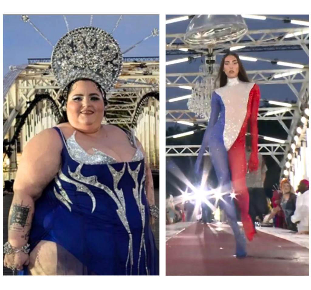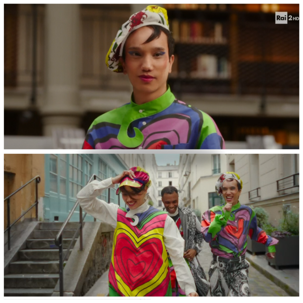 … difficile diventa invece sorvolare sul defilé appositamente offerto nel sesto quadro, dei dodici totali della cerimonia, inaugurato dalla madrina queer Barbara Butch ove si dà un’immagine planetaria del concetto di festivité francese attraverso il mondo della moda e dell’ “amore…” interpretato dai giovani designers selezionati dalla Bürki.
