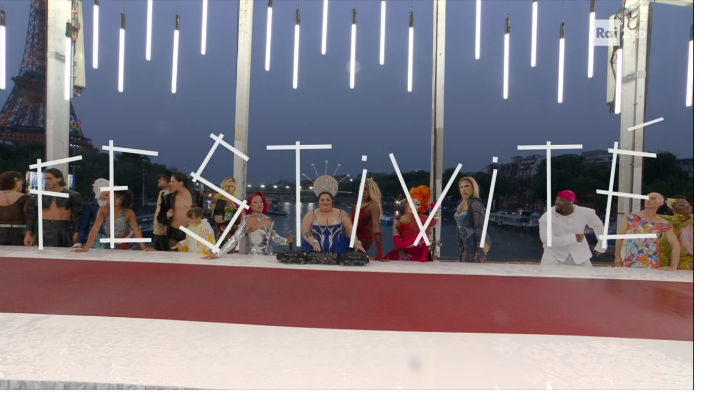 Sulle note della dj icona LGBT Barbara Butch, incoronata di Swarowsky e vestita dal giovane talento e designer parigino Victor Weinsanto , la mise en scene del sesto quadro “FESTIVITÉ” della Cerimonia d’Apertura dei Giochi Olimpici di Parigi 2024, firmata nella sua totalità dal direttore artistico Thomas Jolly, intrinseco omaggio alla moda parigina quale palco mondiale dell’inclusione e dell’amore, diviene un’ordinata installazione sequenziale di modelli, drag queen e performers sembrerebbero emblematicamente disposti come gli “Apostoli dell’Ultima Cena” (l’equivoco verrà chiarito solo il giorno a seguire) attorno alla tornita ed iconica dj quale divinità che dà l’avvio alle danze.