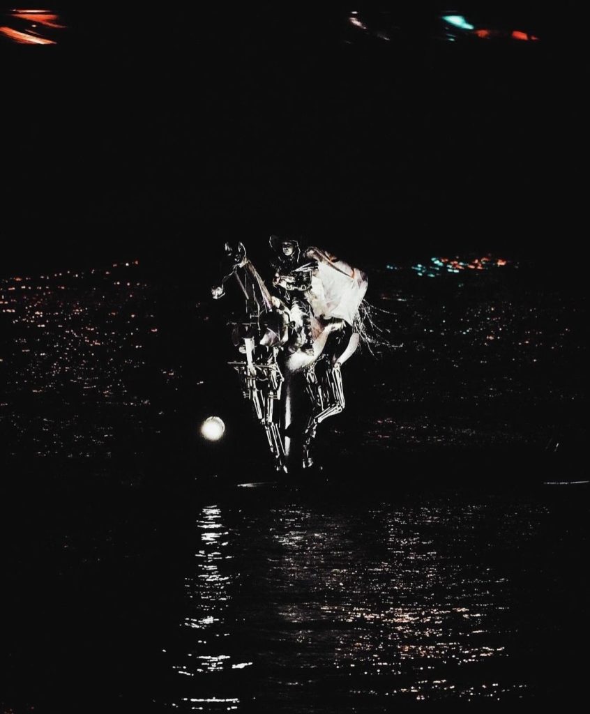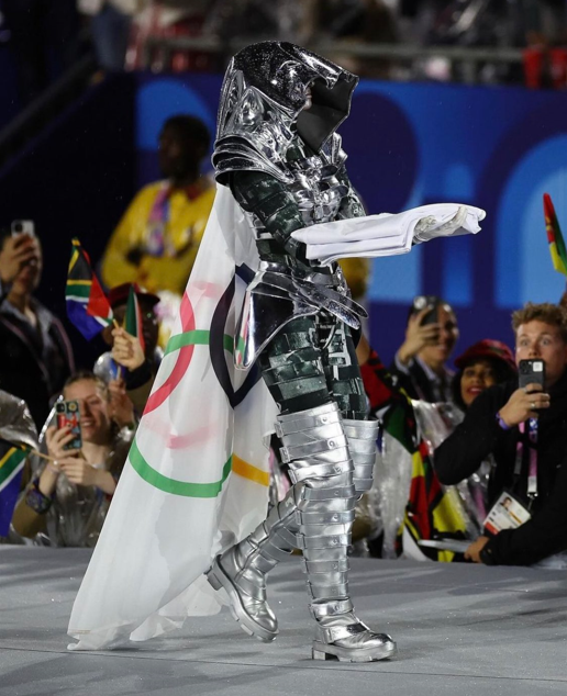 Un suggestivo bagliore nel buio (in senso stretto ed in senso lato) ci offre una Giovanna D’Arco, Santa Patrona di Francia, rivisitata in un’argentea moderna armatura in cuoio che col volto coperto cavalca la Senna sul suo futuristico metallico destriero, conducendo il Vessillo Olimpico sino ai piedi della Tour Eiffel.