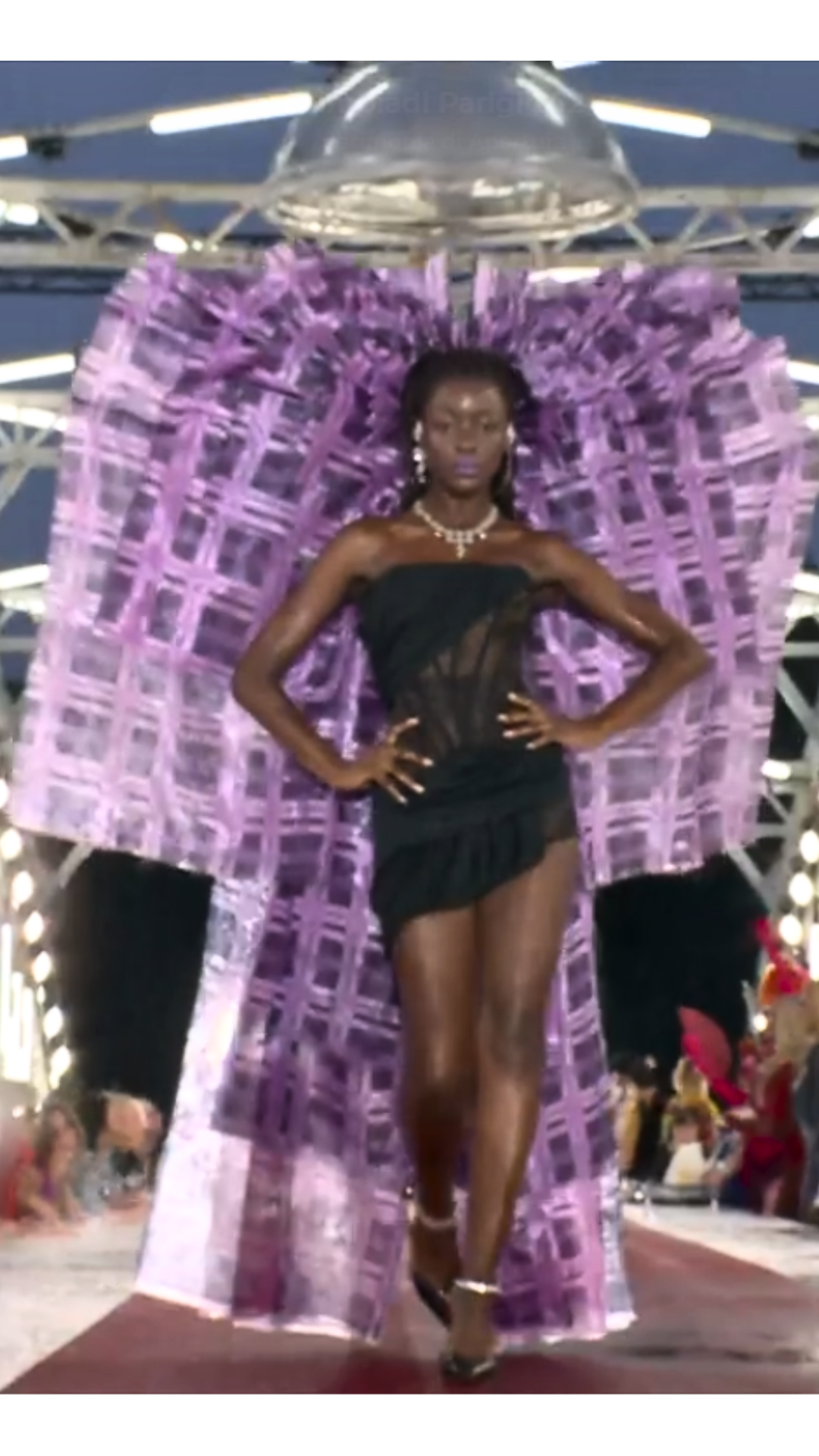 Apre le danze l’ex indossatrice Farida Khelfa, con un abito, sempre rosa, realizzato interamente con scarti di riciclo parigino e tagliato al laser dall’atelier Cutter Desing. Abito di per sé gradevole ma totalmente decontestualizzato e reso privo di carattere nella “non – collezione” in passerella , giacché circondato da una moltitudine di coloratissime, truccatissime ed aggressivissime drag on stage, e non solo, in grado d’ invalidare la centralità della non così riuscita mise en scene stessa degli abiti indossati.