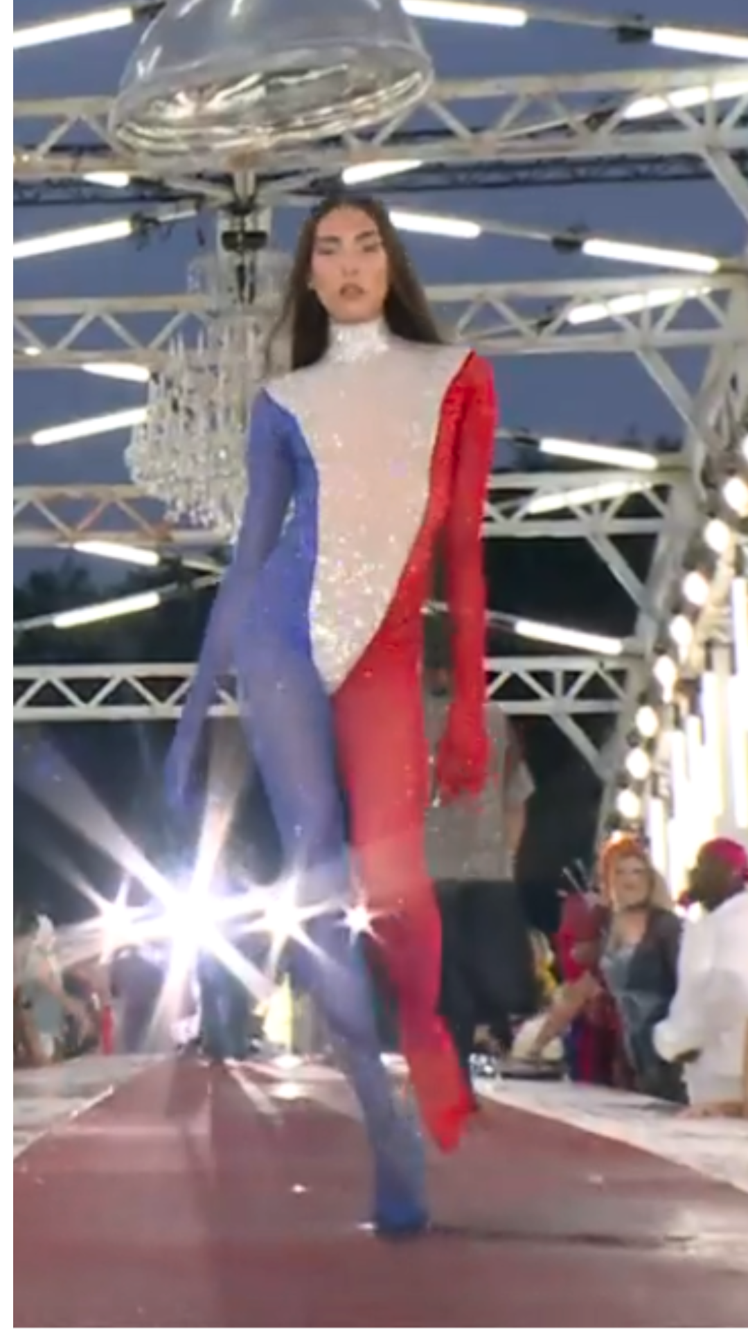 A seguire nella parata in passerella osserviamo l’alternarsi di abiti eterogenei come la tuta guanto di una sexy bandiera francese nuovamente firmata Gilles Aquin, un’immagine simbolo del paese ospitante i Giochi dunque interessante se non fosse per l’isterico ancheggiare della filiforme mannequin, la transgender Raya Martigny.