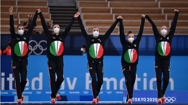 A Tokyo infatti, questi ultimi vengono plasmati dal designer quale tributo al Paese ospitante, la scritta ITALIA viene sviluppata in verticale anziché in orizzontale sulla schiena, su ispirazione dei caratteri “kanji” giapponesi e con il tricolore circolare all’altezza del plesso solare “circa” omaggio iconografico al Sol Levante.