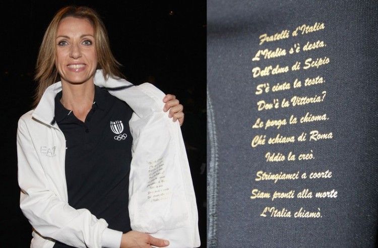 Un kit di 50 pezzi (comprensivo di giacche, polo, scarpe, divise ecc..) consegnato agli atleti che già prevedevano il doppio colore bianco e blu notte, in uso fino agli 70, una tonalità scelta da Armani per trasmettere l’idea di eleganza e continuità con la tradizione, ove all’interno della giacca, dal lato del cuore, venne fatto stampare in oro corsivo l’Inno di Mameli.
